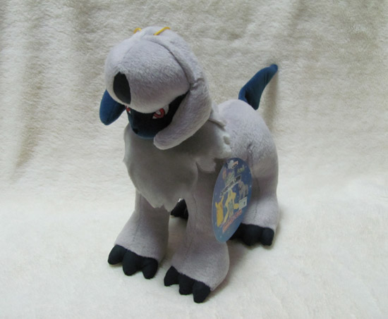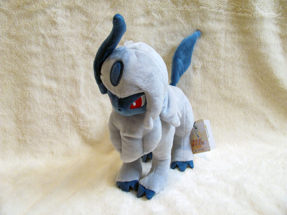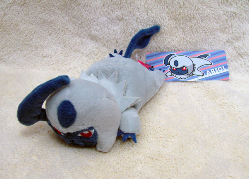 The largest of the four Absol plush made, this is also the most common, although still difficult to find. It is beautiful and large, and has a softer touch than the Ichiban-Kuji lottery plush. This plush was once an amusement prize in commemoration of the sixth Pokémon movie, Wishing Star of Seven Nights: Jirachi.