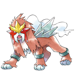 A Volcano Pokémon. When Entei barks, a volcano erupts, and it's said that a new Entei is born every time a volcano appears. A proverb claims that the warmth of summer is created by Entei racing through the clouds. Entei uses Fire Spin, a flaming vortex that traps and damages foes for multiple turns.
